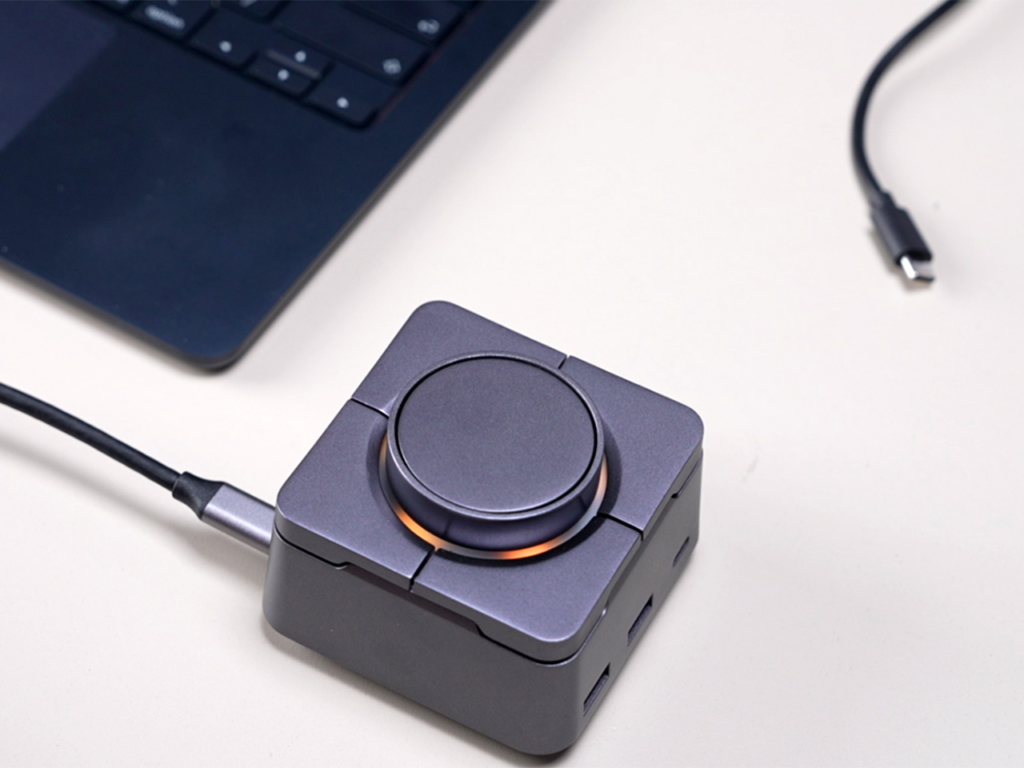 Programmable shortcut buttons and a control knob on the top surface provide quick access to functions such as volume control, screen capture, and system commands. The device fits into a palm-sized cube designed for travel.
